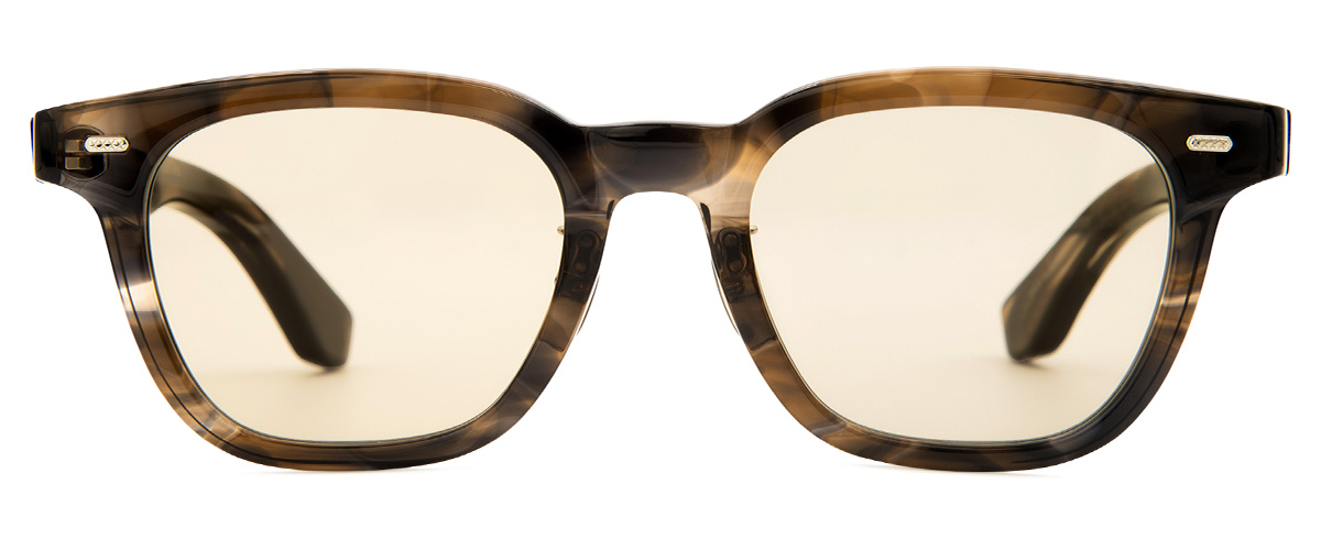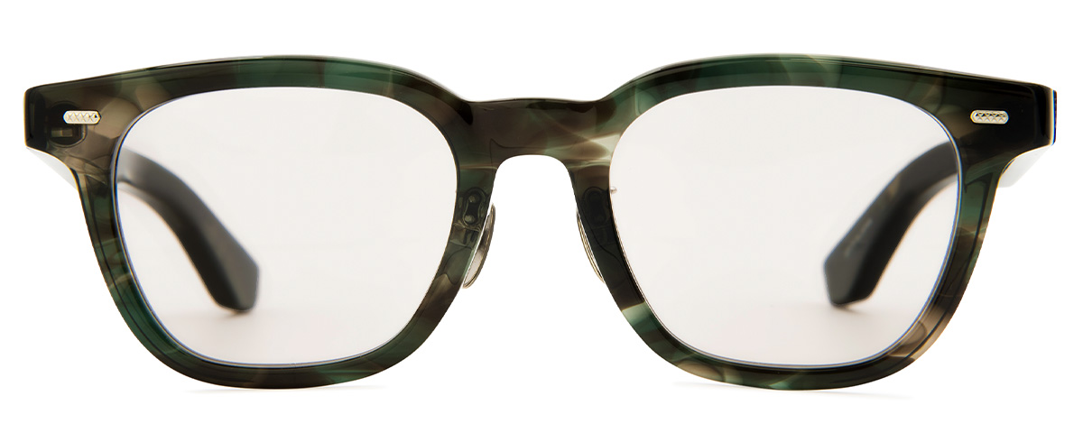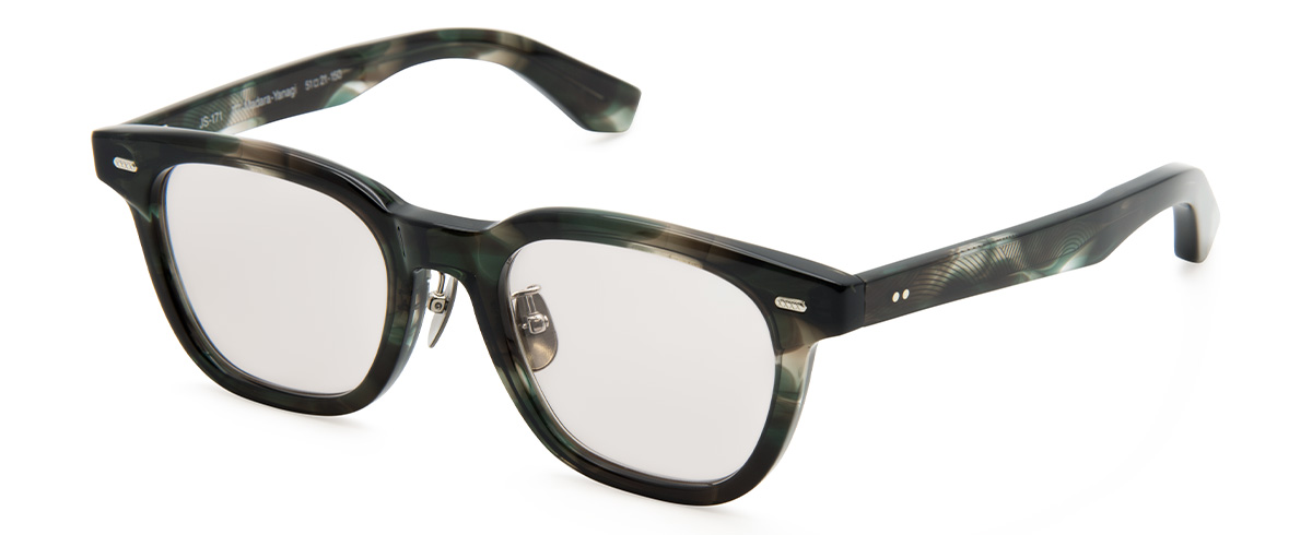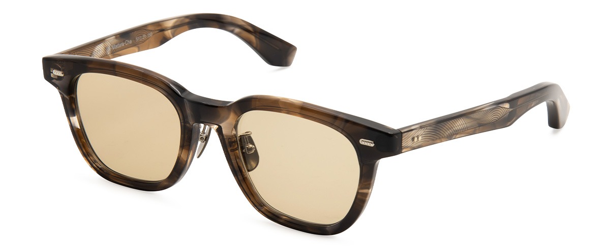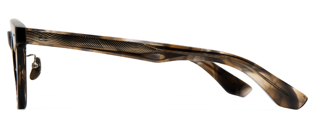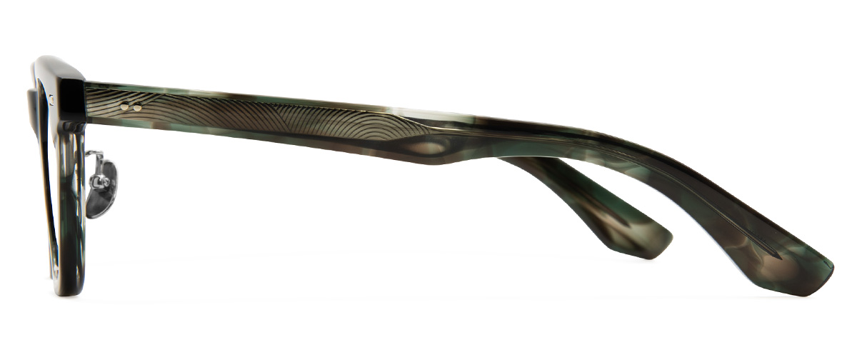 程よいボリューム感のあるLサイズのウェリントンタイプ。Col.01,03はクリア系の単色生地でまとめ、Col.02,04は二層生地の削り出しによるグラデーションカラーで自然な立体感を表現。ブリッジからヨロイにかけて厚みの抑揚をつけたフロントに加え細部に至るまでサイズバランスやシルエットを突き詰め、より目元を引き立たせるデザインに仕上げました。装着感にこだわったテンプルは、ヨロイ側3.5mmからテンプルエンドに向かって6mmへと厚みに抑揚をつけフレーム全体の比重バランスを考慮した設計になっており、見た目に反して軽やかな掛け心地です。特殊なブラスト加工を施したマイクロチタンパッドは汗でも滑りにくいマット仕様。枯山水を模したテンプル芯や、欄間などに使用される組子細工を模したフロントの飾鋲など、随所に緻密で繊細なsenseの世界観を体現しています。