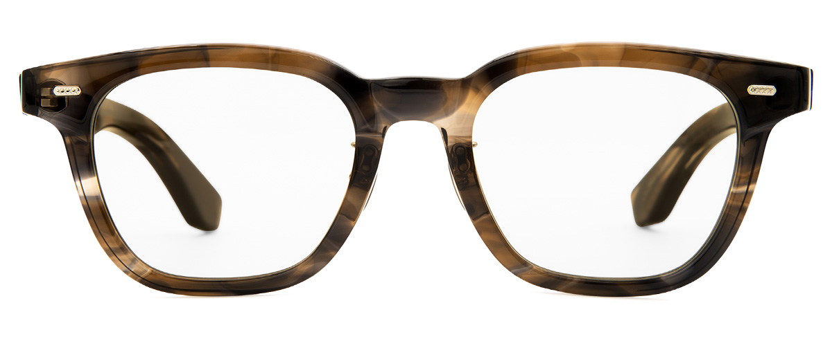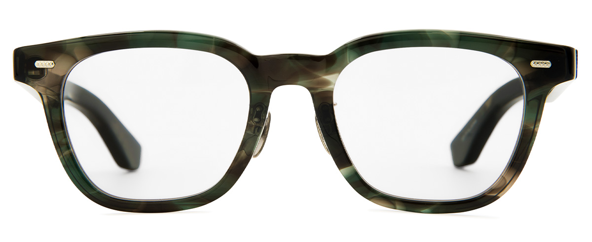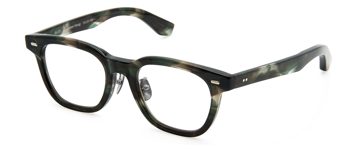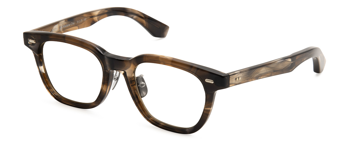 程よいボリューム感のあるLサイズのウェリントンタイプ。Col.01,03はクリア系の単色生地でまとめ、Col.02,04は二層生地の削り出しによるグラデーションカラーで自然な立体感を表現。ブリッジからヨロイにかけて厚みの抑揚をつけたフロントに加え細部に至るまでサイズバランスやシルエットを突き詰め、より目元を引き立たせるデザインに仕上げました。装着感にこだわったテンプルは、ヨロイ側3.5mmからテンプルエンドに向かって6mmへと厚みに抑揚をつけフレーム全体の比重バランスを考慮した設計になっており、見た目に反して軽やかな掛け心地です。特殊なブラスト加工を施したマイクロチタンパッドは汗でも滑りにくいマット仕様。枯山水を模したテンプル芯や、欄間などに使用される組子細工を模したフロントの飾鋲など、随所に緻密で繊細なsenseの世界観を体現しています。